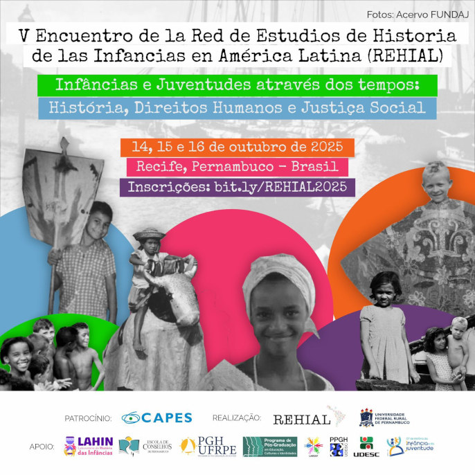 Mais informações e inscrições: https://www.even3.com.br/v-encontro-da-rehial-infancias-e-juventudes-atraves-dos-tempos-historia-direitos-humanos-e-justica-social-588646/