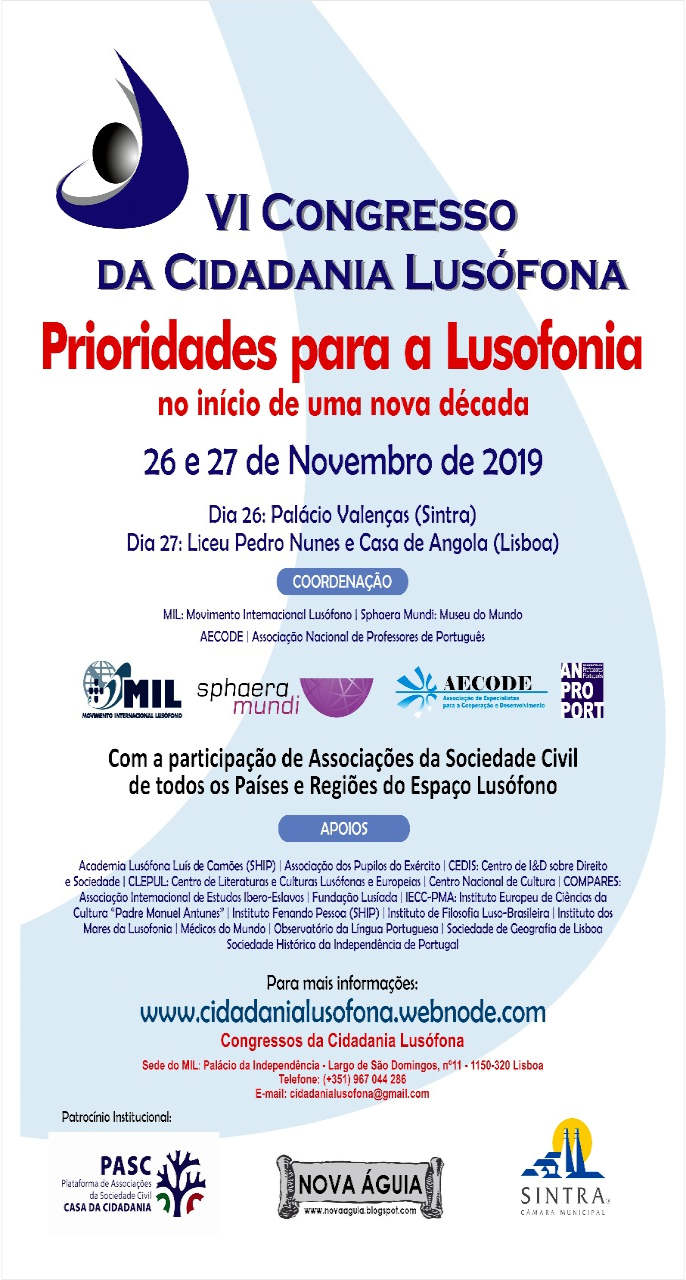 O Palácio Valenças (Sintra), o Liceu Pedro Nunes e a Casa de Angola (Lisboa) sediam nos dias 26 e 27 de novembro de 2019 a sexta edição do Congresso da Cidadania Lusófona, subordinado ao tema Prioridades para a lusofonia no início de uma nova década.
