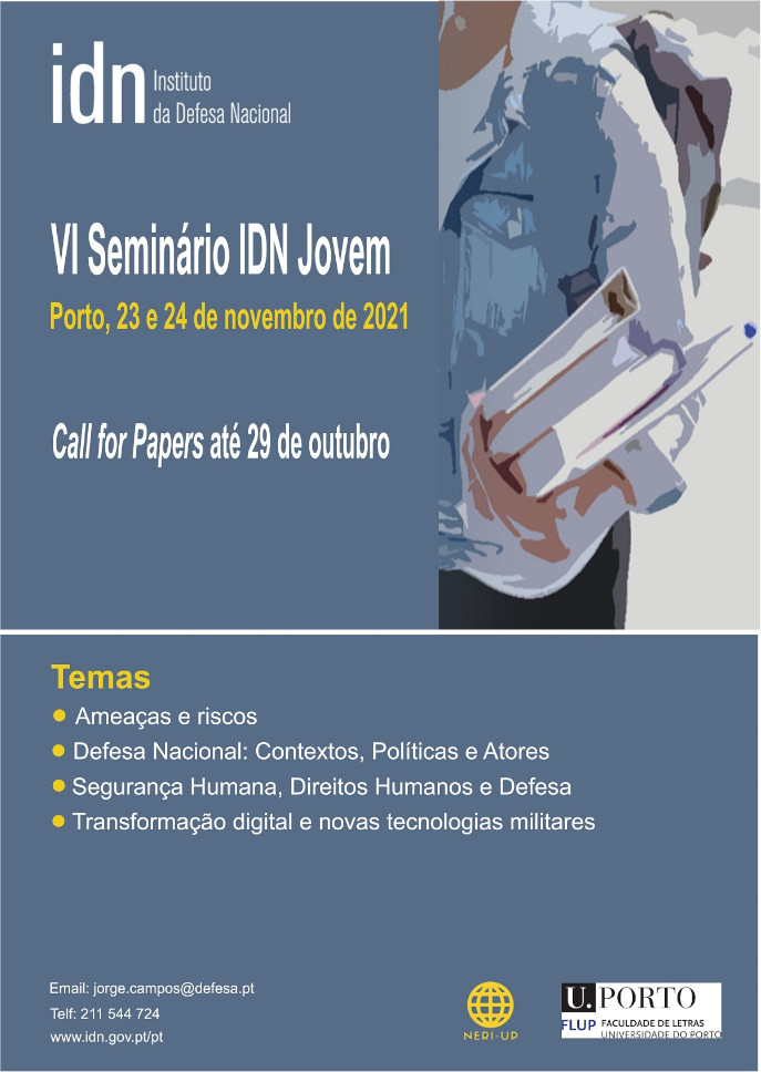 Desta forma, numa organização conjunta de diversos Núcleos de Estudantes de Ciência Política e de Relações Internacionais de Estabelecimentos de Ensino Superior Portugueses, em parceria com o IDN, realizar-se-á o “VI seminário IDN Jovem” que terá lugar em 23 e 24 de novembro de 2021 na Faculdade de Letras da Universidade do Porto (FLUP), na cidade do Porto, destinado a todos os estudantes do ensino superior que entendam concorrer.