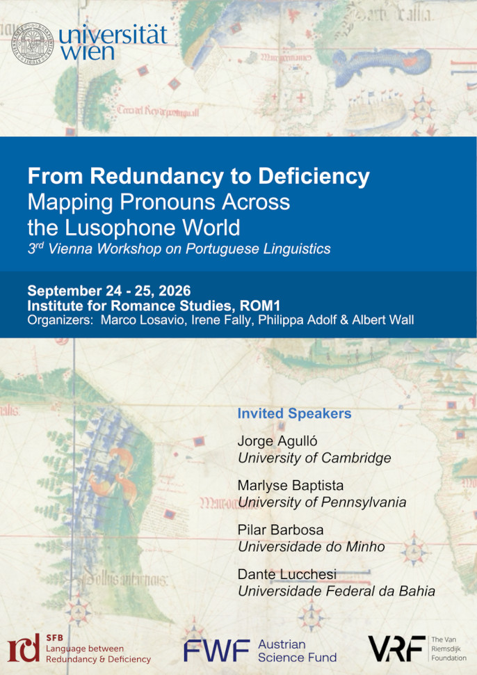 A edição de 2026 dos Vienna Workshops on Portuguese Linguistics realiza-se nos dias 24 e 25 de setembro na Universidade de Viena e é inteiramente dedicada aos pronomes e sistemas pronominais no mundo lusófono e variedades relacionadas. O evento reúne investigadores que trabalham sobre o português europeu, brasileiro e africano, o galego e os crioulos de base portuguesa.