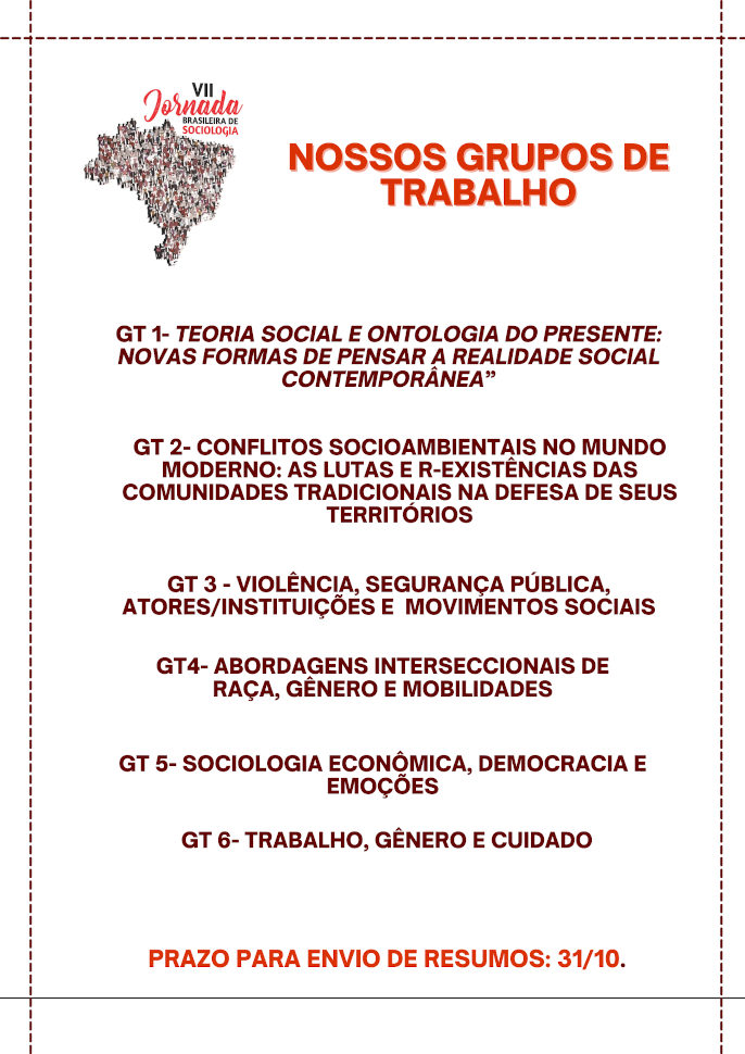 A VII Jornada Brasileira de Sociologia, em sua sétima edição, tem como tema a "Sociologia Brasileira: Pensando e repensando o Brasil em tempos de crise". A ideia deste pensamento surge a para pensar o Brasil a partir do eixo de questões sociais do Brasil presente: saúde pública, economia e política, violência, trabalho, gênero e relações raciais. Como a sociologia Brasileira tem encarado essas questões, que muitas das vezes é muito singular a tecitura social do Brasil e ao desenvolvimento do capitalismo hipertardio.