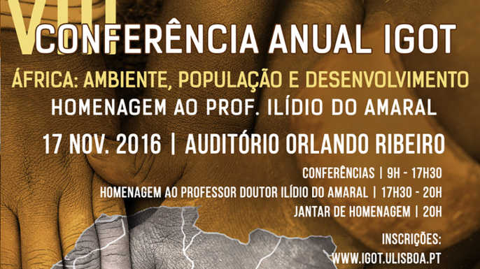 O Instituto de Geografia e Ordenamento do Território, com o patrocínio da Caixa Geral de Depósitos, organiza a VIII conferência anual do IGOT, desta vez com o tema “África: Ambiente, População e Desenvolvimento”. A Conferência terá uma Sessão especial de Homenagem ao Professor Doutor Ilídio do Amaral.