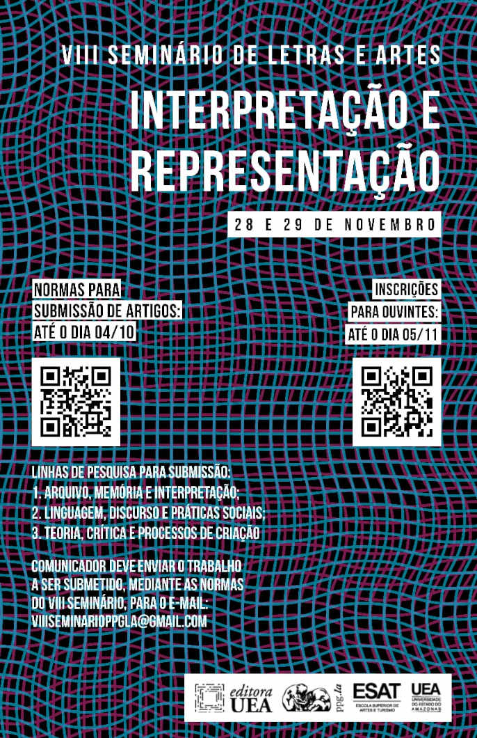 Nos dias 28 e 29 de novembro de 2019 ocorrerá a oitava edição do Seminário de Letras e Artes do Programa de Pós-Graduação em Letras e Artes da Universidade do Estado do Amazonas (PPGLA-UEA), com o tema Interpretação e Representação.