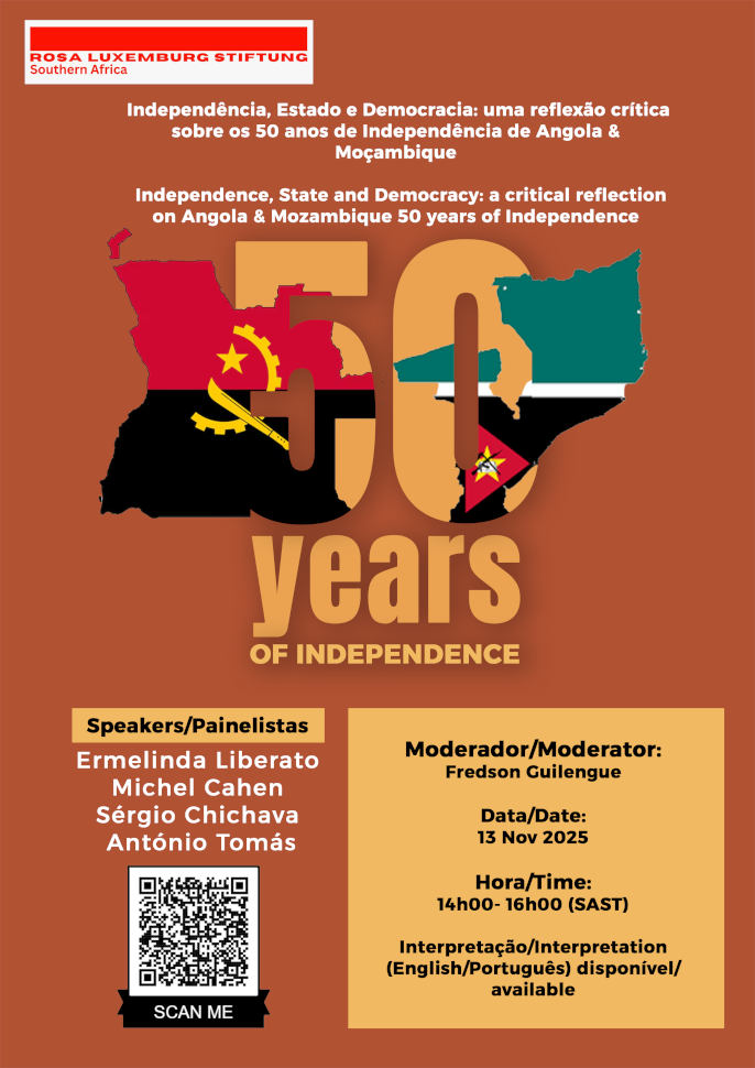 A Fundação Rosa Luxemburg (Rosa Luxemburg Stiftung Southern Africa) convida para o Webinário "Independência, Estado e democracia: uma reflexão crítica sobre os 50 anos de independência de Angola e Moçambique" / "Independence, State and Democracy: a critical reflection on Angola & Mozambique 50 years of Independence".
