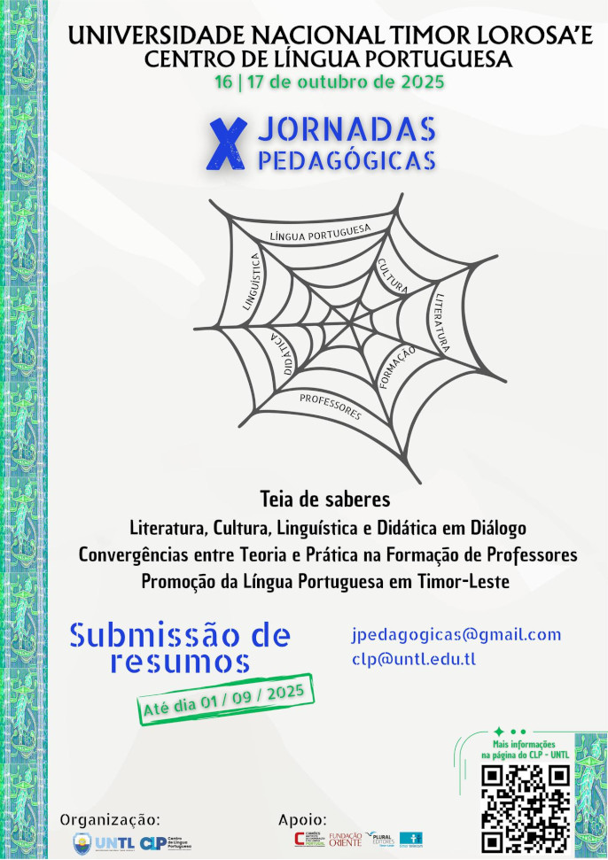 O Centro de Língua Portuguesa da Universidade Nacional Timor Lorosa’e (CLP-UNTL) convida toda a comunidade académica, professores, estudantes e interessados no ensino da língua portuguesa a participar nas X Jornadas Pedagógicas, nos dias 16 e 17 de outubro de 2025.