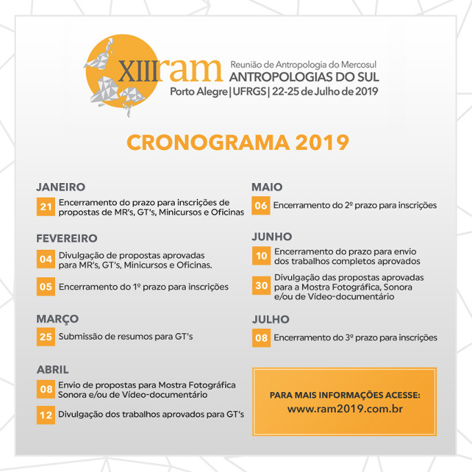 A XIII RAM - Reunião de Antropologia do Mercosul: Antropologias do Sul ocorrerá entre os dias 22 e 25 de julho de 2019, em Porto Alegre-RS. Realizado bienalmente, em 2019 o evento tem organização do Programa de Pós-graduação em Antropologia Social da Universidade Federal do Rio Grande do Sul (PPGAS UFRGS) e apoio da UFRGS, do IFCH/UFRGS, da PROREXT/UFRGS, da Associação Brasileira de Antropologia - ABA e da Associação Brasileira de Pesquisadores em Cibercultura - ABCiber.