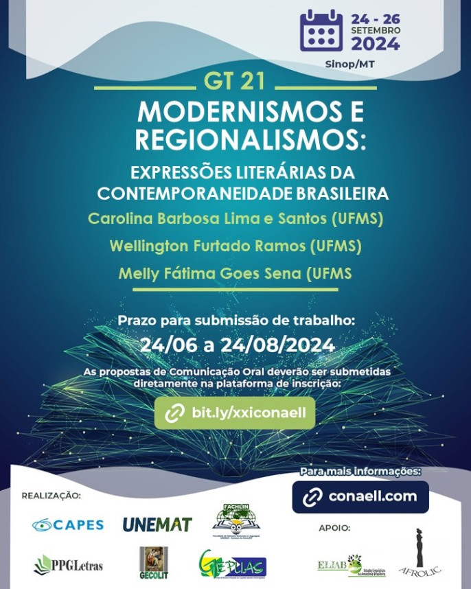 Convidamos, em especial, a apresentarem suas propostas de trabalho ao GT 21 Modernismos e Regionalismos: expressões literárias da contemporaneidade brasileira.
