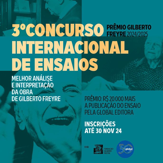 O 3º Concurso Internacional de Ensaios – Prêmio Gilberto Freyre 2024/2025 está com inscrições abertas até 30 de novembro de 2024. Esta será a décima edição do concurso e a terceira no formato internacional, que receberá trabalhos inéditos, escritos em português, oriundos de qualquer país, além do Brasil.