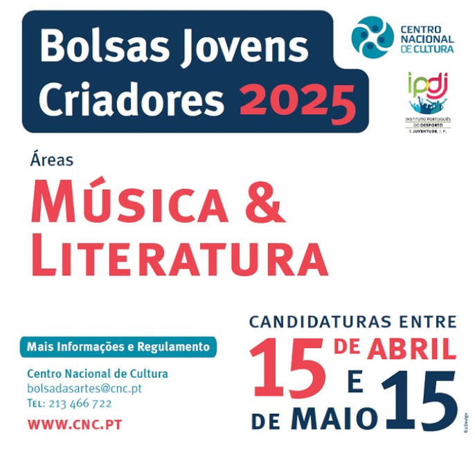 O Centro Nacional de Cultura (CNC), em parceria com o Instituto Português do Desporto e Juventude, acaba de lançar o concurso para a edição 2025 do programa Bolsas Jovens Criadores, nas áreas de Música e Literatura. Em 2025 serão atribuídas 4 bolsas. As candidaturas deverão ser enviadas até ao dia 15 de maio.