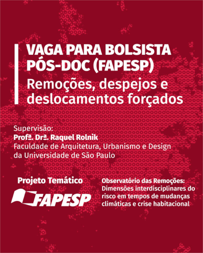 Link com mais informações sobre o Processo Seletivo: https://www.labcidade.fau.usp.br/vaga-de-pos-doc-remocoes-despejos-deslocamentos/