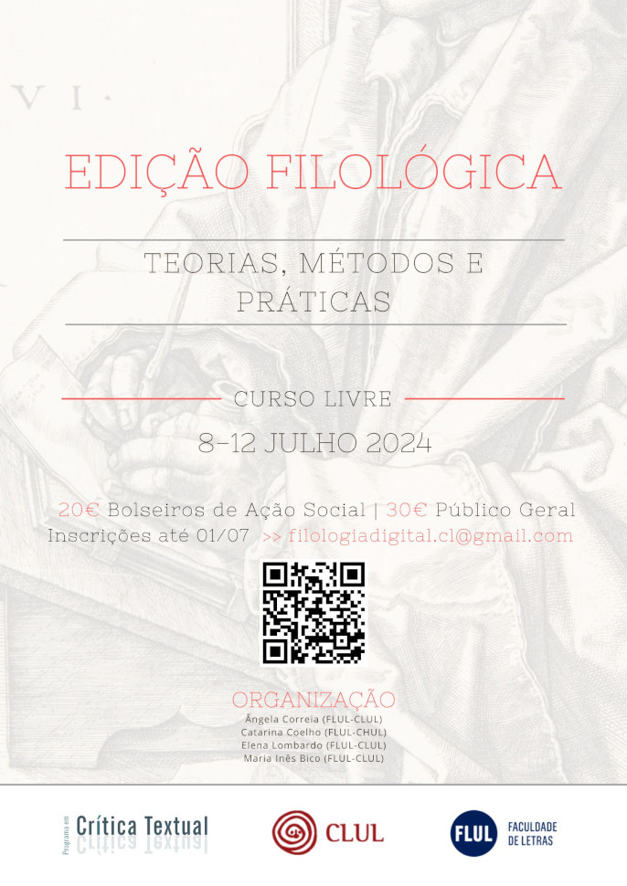 Este curso inscreve-se na inciativa Do pergaminho ao computador: editar manuscritos na era digital, cujo objeto são as edições filológicas digitais e que se articula em cinco módulos. Prevê-se que estes proporcionem uma aprendizagem sobre o tema, representando o presente programa um primeiro contacto com conceitos básicos de Crítica Textual e da Filologia Digital. Almejamos, todavia, que a função do presente módulo não se esgote na sua ligação aos demais, uma vez que se pretende com ele divulgar a prática editorial filológica junto de toda a comunidade - e, em particular, junto de alunos de licenciatura e potenciais mestrandos/as interessados/as na área.
