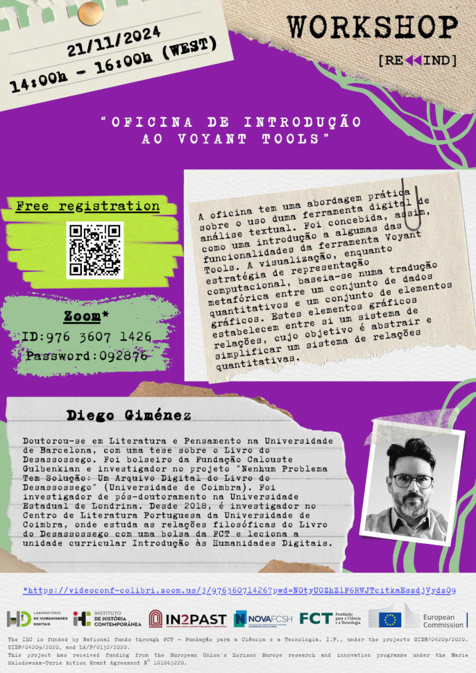 A oficina tem uma abordagem prática sobre o uso duma ferramenta digital de análise textual. Foi concebida, assim, como uma introdução a algumas das funcionalidades da ferramenta Voyant Tools. A visualização, enquanto estratégia de representação computacional, baseia-se numa tradução metafórica entre um conjunto de dados quantitativos e um conjunto de elementos gráficos. Estes elementos gráficos estabelecem entre si um sistema de relações, cujo objetivo é abstrair e simplificar um sistema de relações quantitativas.