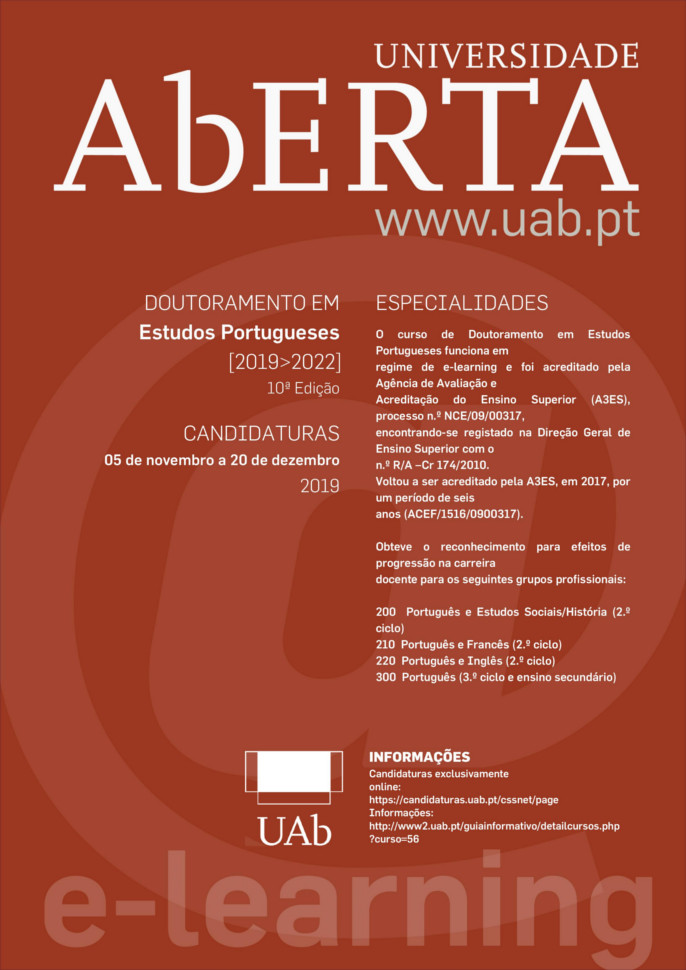 Está a decorrer a 3.ª fase de candidaturas à 10.ª edição do curso de Doutoramento em Estudos Portugueses (2019>2022) da Universidade Aberta.