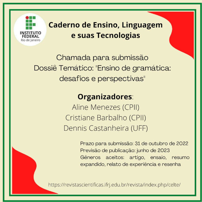 O Caderno de Ensino, Linguagens e suas Tecnologias (CELTE), publicado pelo Instituto Federal de Educação, Ciência e Tecnologia do Rio de Janeiro receberá submissões em setembro e outubro de 2022 para o dossiê temático "Ensino de gramática: desafios e perspectivas", organizado por Aline Menezes (CPII), Cristiane Barbalho (CPII) e Dennis Castanheira (UFF), e com previsão de publicação em junho de 2023.