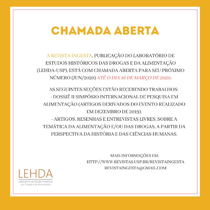 Segue até o dia 16 de março de 2020 a chamada de trabalhos para a próxima edição da revista acadêmica INGESTA (ISSN: 2596-3147). Lançada em março de 2019, a publicação é editada por pós-graduandos em História Social da Universidade de São Paulo, membros do Laboratório de Estudos Históricos das Drogas e da Alimentação (LEHDA-USP), sob a coordenação do professor Henrique Carneiro. Recebe artigos relacionados à temática da alimentação e das drogas, produzidos por pesquisadores que sejam, no mínimo, mestrandos em programas de pós-graduação de todo o Brasil e do mundo. Os artigos podem ser submetidos em português, inglês e espanhol.