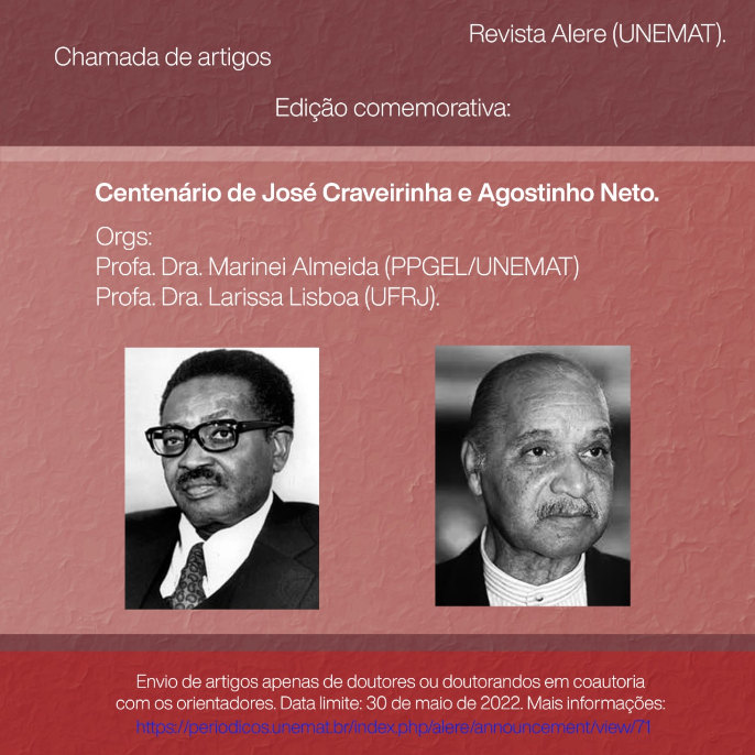 A constituição da historiografia literária africana de língua portuguesa tem como construção basilar os projetos nacionais que trouxeram importantes nomes de escritores dos países africanos de língua portuguesa. É sabido que alguns desses, além do exercício literário, foram partícipes das lutas pelas Independências de seus países. Nesse âmbito, consagram-se dois nomes fundamentais aos estudos críticos literários, em Moçambique, José Craveirinha (nascido em Lourenço Marques – atual Maputo - a 05 de maio de 1922) e, em Angola, Agostinho Neto (Aldeia de Kexicane, região de Ícolo e Bengo, a 17 de setembro de 1922). Em 2022, ano em que se comemorará os seus centenários de nascimento, a Revista ALĔRE convida pesquisadores para a contribuição de artigos que tratem, sobretudo, de suas obras artísticas.