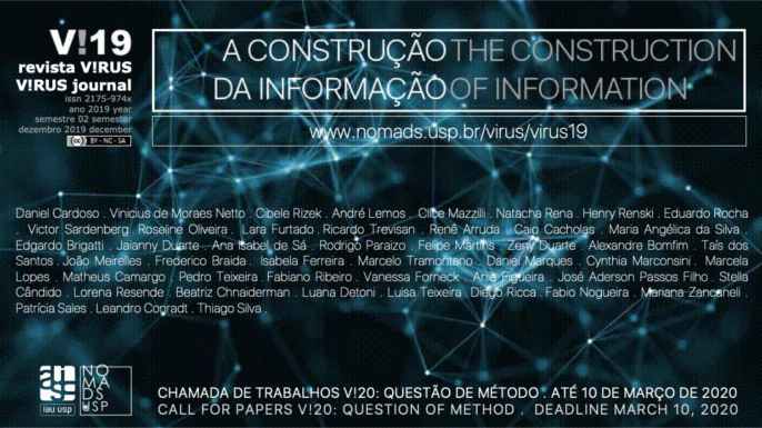 A décima nona edição da revista V!RUS está online, disponível em www.nomads.usp.br/virus/virus19, sobre o tema A construção da informação.