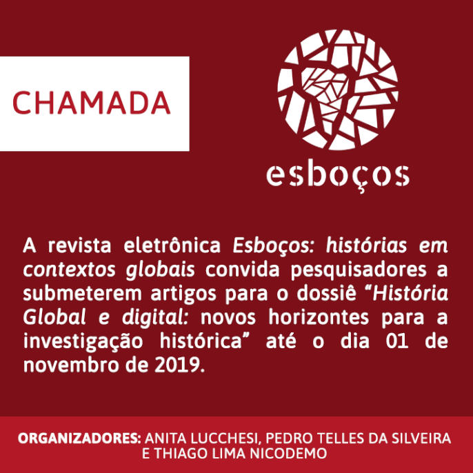 A revista Esboços: histórias em contextos globais convida pesquisadoras e pesquisadores a submeterem artigos para o dossiê "História global e digital: novos horizontes para a investigação histórica", organizado por Anita Lucchesi (Luxembourg Centre for Contemporary and Digital History), Pedro Silveira (Universidade Federal do Rio Grande do Sul) e Thiago Lima Nicodemo (Universidade Estadual de Campinas). Os artigos devem ser enviados até 01 de novembro de 2019 através da plataforma da revista. O dossiê será publicado no v. 27, n. 45, maio/ago. 2020.