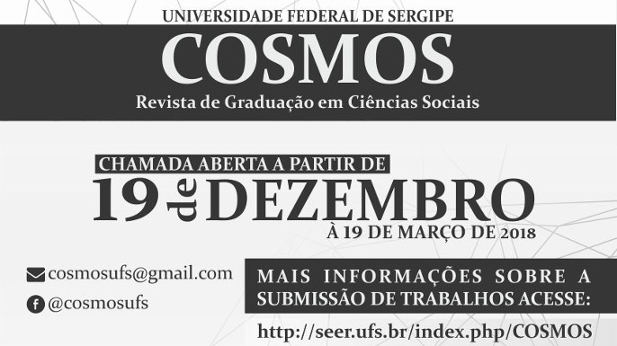 Encontra-se aberta a chamada para submissões de trabalhos para a COSMOS - Revista de Graduação em Ciências Sociais, uma publicação eletrônica com periodicidade semestral, organizada pelos estudantes de graduação em Ciências Sociais no Departamento de Ciências Sociais da Universidade Federal de Sergipe. O período de submissões vai de 19/12/2017 até 19/03/2018.