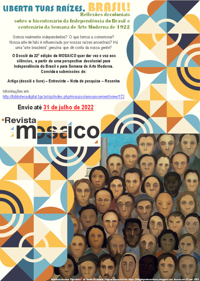 O Dossiê da 22ª edição da MOSAICO propõe uma reflexão decolonial para o marco dos 200 anos da Independência do Brasil e do centenário da Semana de Arte Moderna de 1922, nas áreas de Ciências Humanas e Sociais.