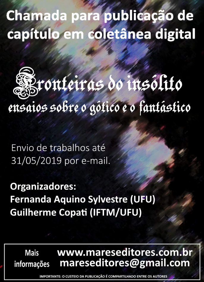 Chamada para submissão de trabalhos para a publicação do e-book Fronteiras do insólito: ensaios sobre o gótico e o fantástico, que será organizado pela prof. Fernanda Sylvestre (UFU) e por Guilherme Copati (IFTM/UFU), e publicado pela Editora Mares.