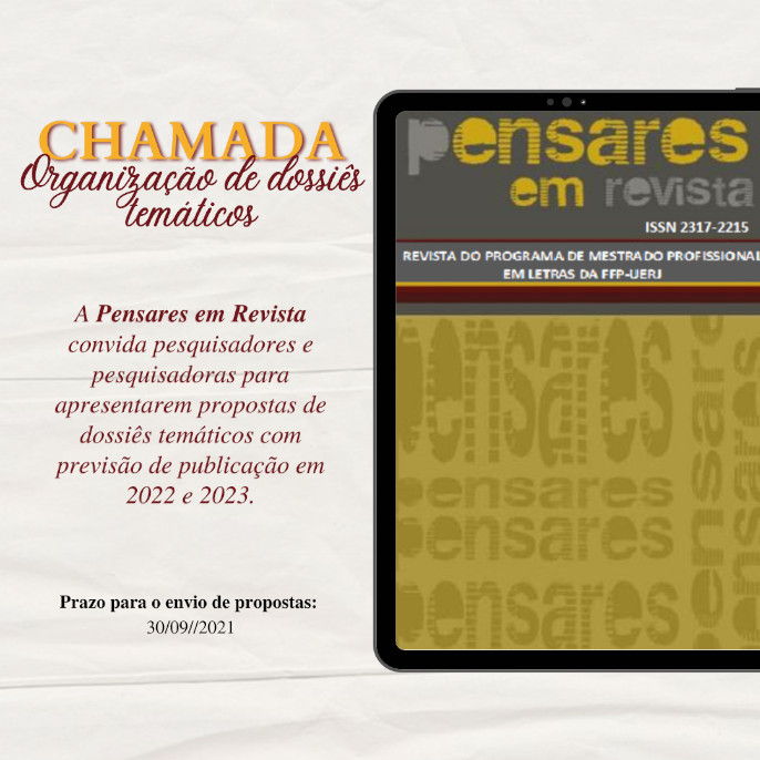 A Pensares em Revista, periódico acadêmico do Programa de Mestrado Profissional em Letras da FFP/UERJ, convida pesquisadores e pesquisadoras para apresentarem propostas de dossiês temáticos com previsão de publicação em 2022 e 2023.