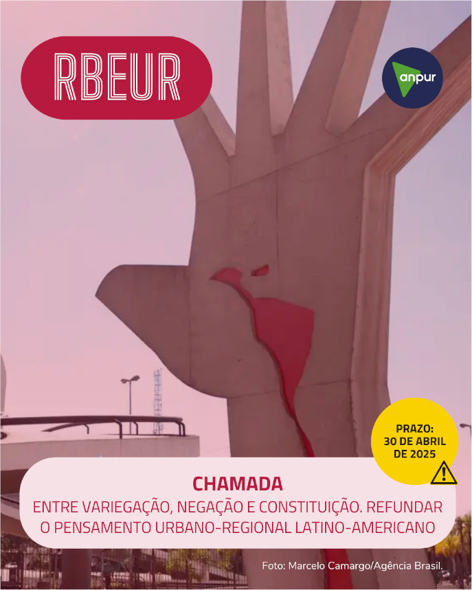 A Revista Brasileira de Estudos Urbanos e Regionais (RBEUR) convida as/os pesquisadoras/es das diversas áreas do conhecimento a encaminhar artigos, individuais ou em coautoria, para o Dossiê Temático Entre variegação, negação e constituição. Refundar o pensamento urbano-regional latino-americano, a ser publicado em número próximo. Serão selecionados artigos submetidos até 30 de abril de 2025, que atendam às exigências de rigor e de excelência e que respeitem as diretrizes da RBEUR (ver: https://rbeur.anpur.org.br/rbeur/about/submissions).