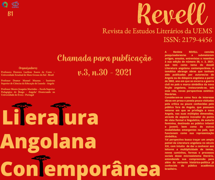 A Revista REVELL convida pesquisadores/as a submeterem artigos, ensaios, entrevistas e resenhas à sua edição de número 30, v. 3, 2021, que tem como tema do dossiê Literatura angolana contemporânea. A temática abrange obras que tenham sido publicadas por autores/as de Angola ou da diáspora angolana a partir de 2002, ano em que se encerra a guerra civil no país e marco simbólico da nova ficção angolana, instaurando-se, sob esse viés, novas perspectivas estético-literárias.