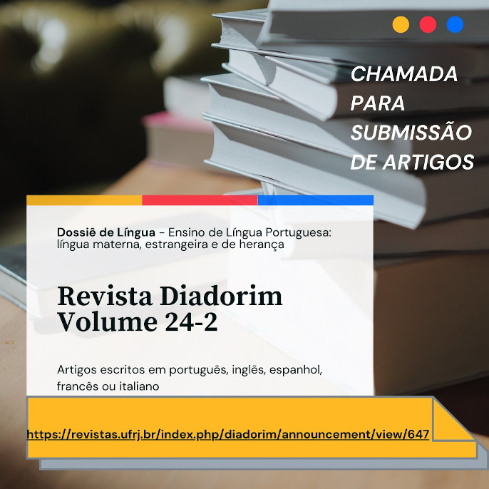 Assim, este número da REVISTA DIADORIM visa a acolher trabalhos teóricos que discutam e problematizem o ensino de Língua Portuguesa, na perspectiva de língua materna, estrangeira ou de herança, que estejam alinhados ao Foco e Escopo da Revista, cujo público-alvo contempla alunos, professores ou pesquisadores de Programas de Pós-Graduação, graduação e ensino básico.