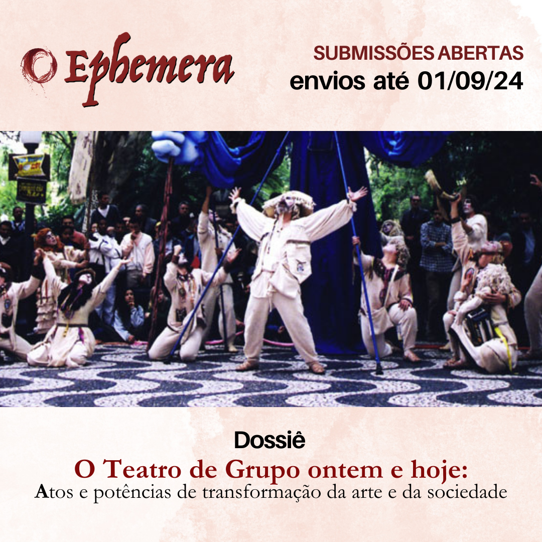 A Revista Ephemera está com submissões abertas para o Dossiê: "O Teatro de Grupo ontem e hoje: atos e potências de transformação da arte e da sociedade" até 1º de Setembro de 2024.