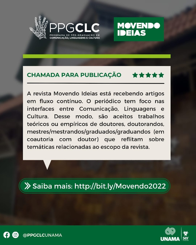 A Movendo Ideias é uma publicação semestral do Programa de Pós-Graduação em Comunicação, Linguagens e Cultura (PPGCLC) da Universidade da Amazônia (UNAMA).